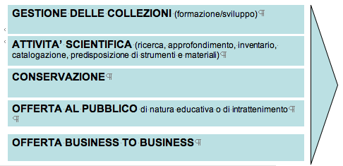 Dal punto di vista dei processi considerati in questa relazione, si ritiene importante evidenziare come l'offerta al pubblico - oggetto precipuo delle scelte di esternalizzazione concretizzate nelle concessioni - sia da considerarsi come un'attività strategica direttamente afferente alla missione dell'istituzione museale.