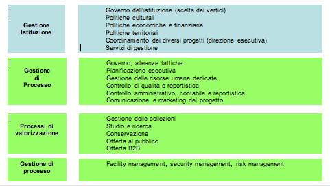- stilizzare i processi produttivi caratteristici delle istituzioni preposte alla "valorizzazione", avendo cura di segmentarli, laddove necessario, su base dimensionale (istituzioni grandi o locali) e funzionale (collezioni, musei di differente natura e patrimonio, siti archeologici ecc.);