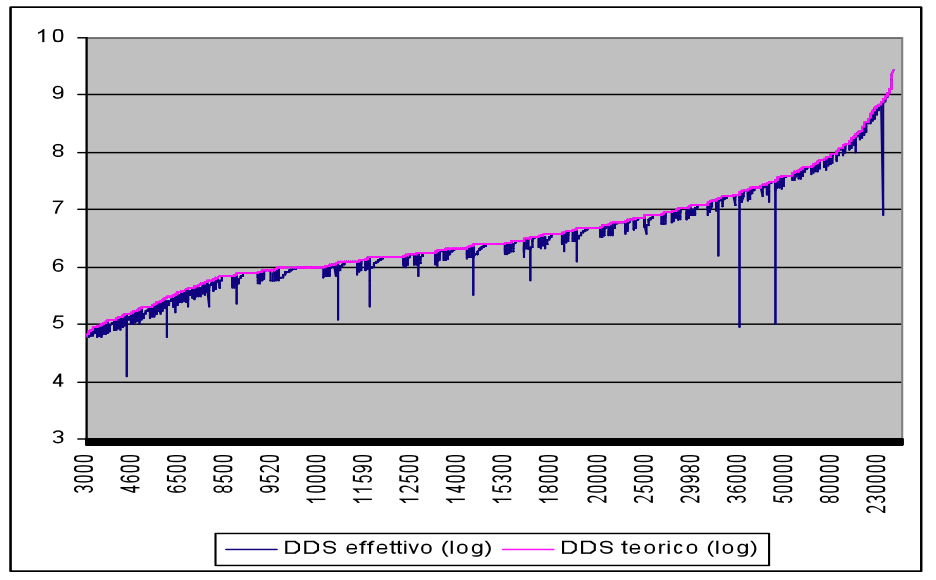 Al fine di rendere più evidente l'osservazione, abbiamo calcolato la medesima relazione in scala semilogaritmica, definendo le relazioni teorica ed effettiva fra il valore della vendita in scala naturale e il diritto di seguito in scala logaritmica. Le relazioni riportate nella Figura 2 rendono ancora più evidente la precedente conclusione: pochi errori idiosincratici, ma tanti scarti sistematici e diffusi che trasformano una relazione matematica in un insieme disperso di osservazioni.