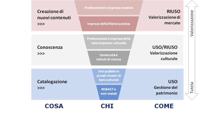 In questo senso il compito dell'ICCD, e più in generale del Mibact, è quello di conquistare un ruolo attivo nella generazione, non di procedure, ma di valori condivisi, andando ad intercettare quelle realtà che hanno bisogno del Catalogo dei beni culturali come soluzione ai propri problemi.