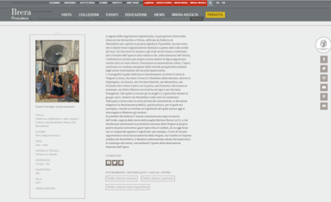 Se cerco la Pala di San Bernardino di Piero della Francesca mi appare la scheda di seguito riportata, in cui, oltre all'immagine dell'opera, trovo informazioni generali ad essa relative (titolo, autore, data, materia e tecnica, dimensioni, numero di inventario, sala nella quale è esposta), nonché una scheda di descrizione.