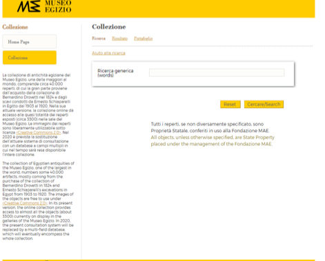 Facciamo un altro esempio e consideriamo la banca dati on line del Museo Egizio di Torino (reperibile all'indirizzo https://collezioni.museoegizio.it/), la cui interfaccia di ricerca si presenta come segue:
