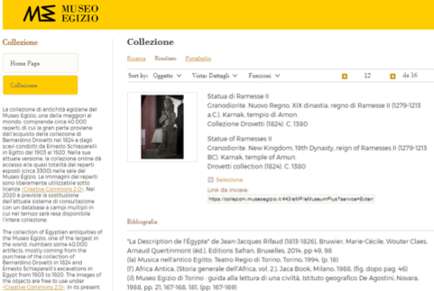 Come si può leggere nello screenshot sopra riprodotto, la collezione on line dà accesso alla quasi totalità dei reperti esposti nelle sale del Museo (circa 3.300). Quanto alla loro ricerca, l'interfaccia prevede un'unica modalità, cioè quella "generica", per parola. Così, se nel campo di ricerca inserisco le parole "Statua di Ramesse II", appaiono vari risultati, tra i quali la scheda dell'opera che sto cercando. Essa contiene l'immagine, il titolo, la datazione, la provenienza e la bibliografia (che nell'immagine sotto riportata è stata parzialmente tagliata per ragioni di spazio):