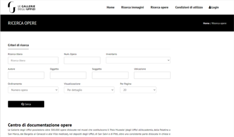 Prendiamo in considerazione l'"Archivio Fotografico e Inventari", dove, come detto, è possibile ricercare sia le schede delle opere sia le immagini delle stesse. L'interfaccia di ricerca, di seguito riprodotto, consente sia una ricerca libera, sia una ricerca per campi specifici, quali autore, oggetto, soggetto, ubicazione, etc.