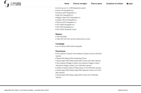 Questa fornisce numerose informazioni sull'opera, tra cui, oltre a quelle generali come il soggetto, le misure o la tecnica, l'indicazione delle mostre nelle quali l'opera è stata esposta, i restauri, la provenienza. Viene fornita anche un'immagine del dipinto con sovraimpressa la scritta "Gabinetto Fotografico", che invita l'utente ad accedere a quest'ultimo. Qui è possibile, tramite criteri di ricerca coincidenti con quelli che consentono la ricerca delle opere, trovare la stessa immagine, oltre a 34 altre immagini relative a particolari del dipinto. A indicare che questo patrimonio iconografico non è liberamente utilizzabile, su ognuna di queste è sovrascritta la dicitura "Gabinetto Fotografico", mentre a fianco è scaricabile il modulo per richiedere il preventivo per poter utilizzare le immagini.