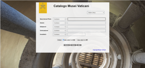 Facciamo ancora un esempio: il catalogo on line dei Musei Vaticani (consultabile all'indirizzo http://www.museivaticani.va/content/museivaticani/it/collezioni/catalogo-online.html). Anche in questo caso l'interfaccia di ricerca, sotto riportata, permette di ricercare un'opera in base ai campi "descrizione/titolo", "autore", "datazione", "collocazione", "inventario".