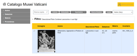 Così, se nel primo campo ("Descrizione/Titolo") inserisco il termine "Laocoonte", posso accedere alla scheda della statua del c.d. Gruppo del Laocoonte (Laocoonte e i suoi figli), in cui trovo informazioni relative agli autori, la data, il materiale, il numero di inventario, oltre che a un'immagine dell'opera: